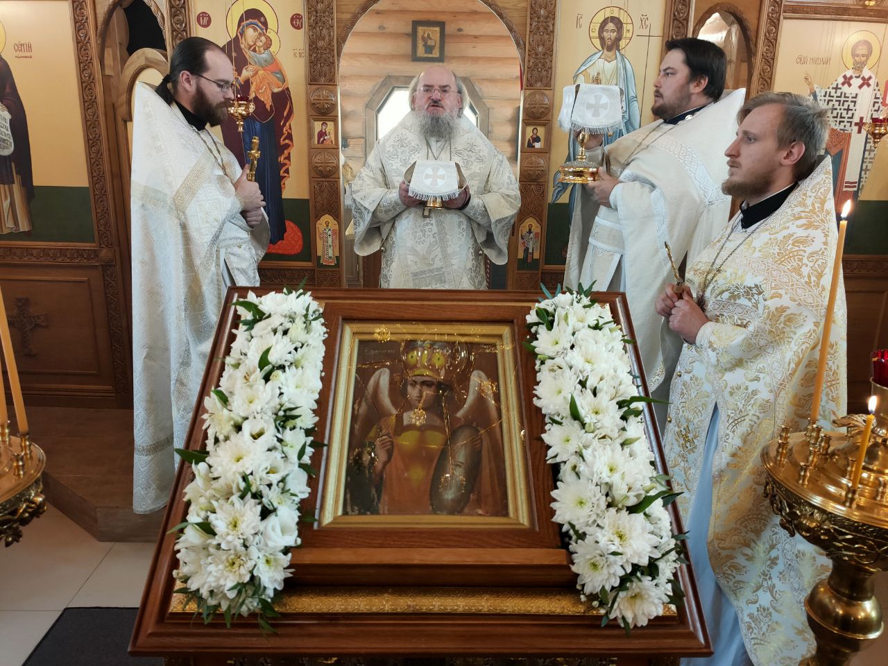По отпусте литургии священнослужители совершили праздничный молебен Небесным Силам Бесплотным, а затем владыка обратился к богомольцам с проповедью.