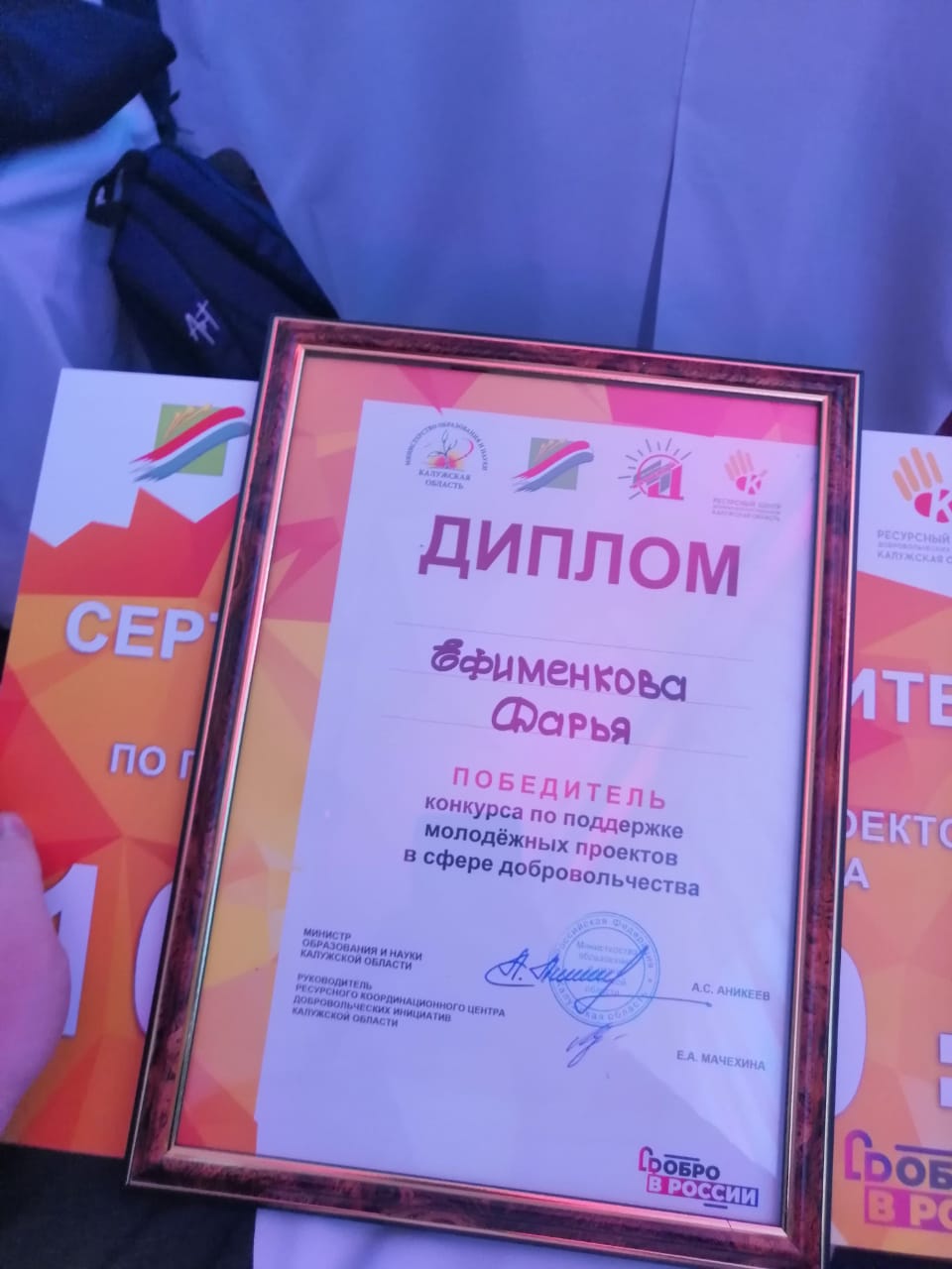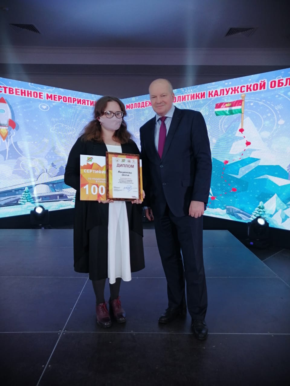 В мероприятии приняла участие сотрудник отдела по делам молодежи Козельской епархии Ефименкова Дарья Владимировна, которая стала победителем в первом региональном конкурсе молодежных проектов в сфере добровольчества в номинации «Малая Родина». Помимо дипломов лучшим из лучших вручили денежные гранты на реализацию своих проектов в размере 100 тысяч рублей.