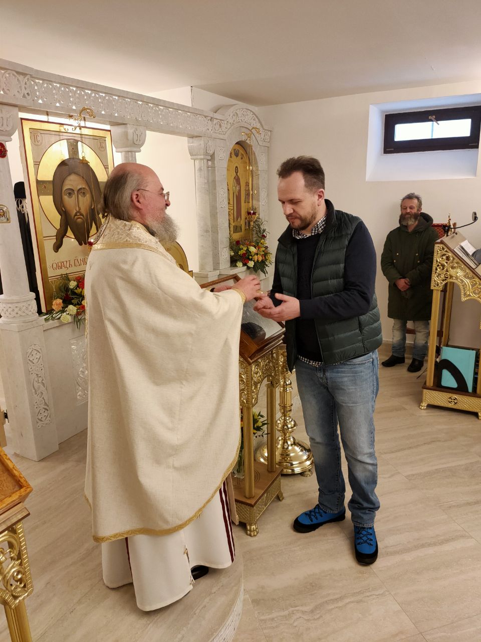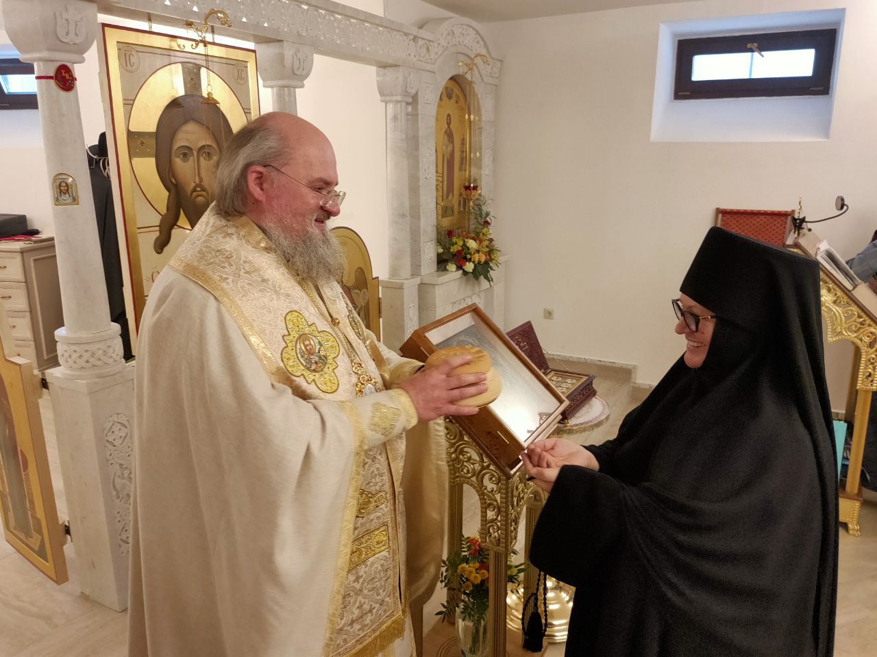 Архипастырь поздравил иеромонаха Филиппа с одиннадцатилетнем монашеского пострига и преподнёс ему святую просфору.