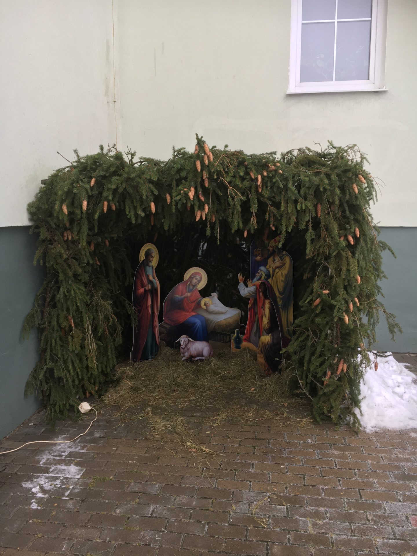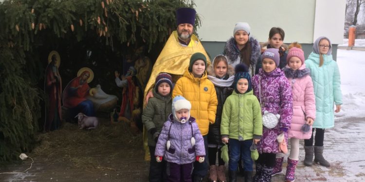 3 января, после Божественной литургии, в храме святых бессребреников и чудотворцев Космы и Дамиана в поселке Думиничи, у его стен, настоятель прихода протоиерей Иоанн Староста открыл праздничную Рождественскую композицию.