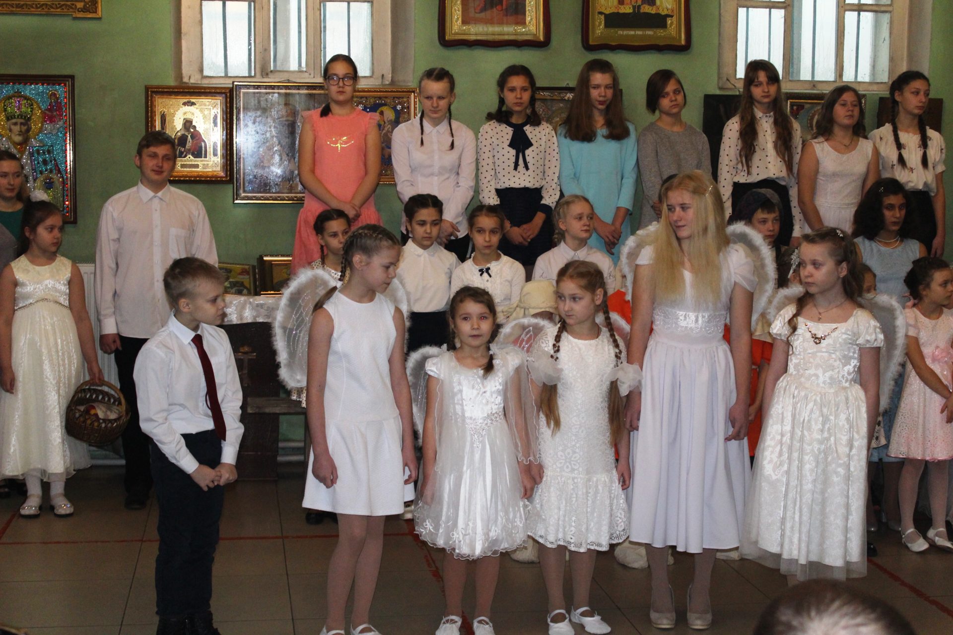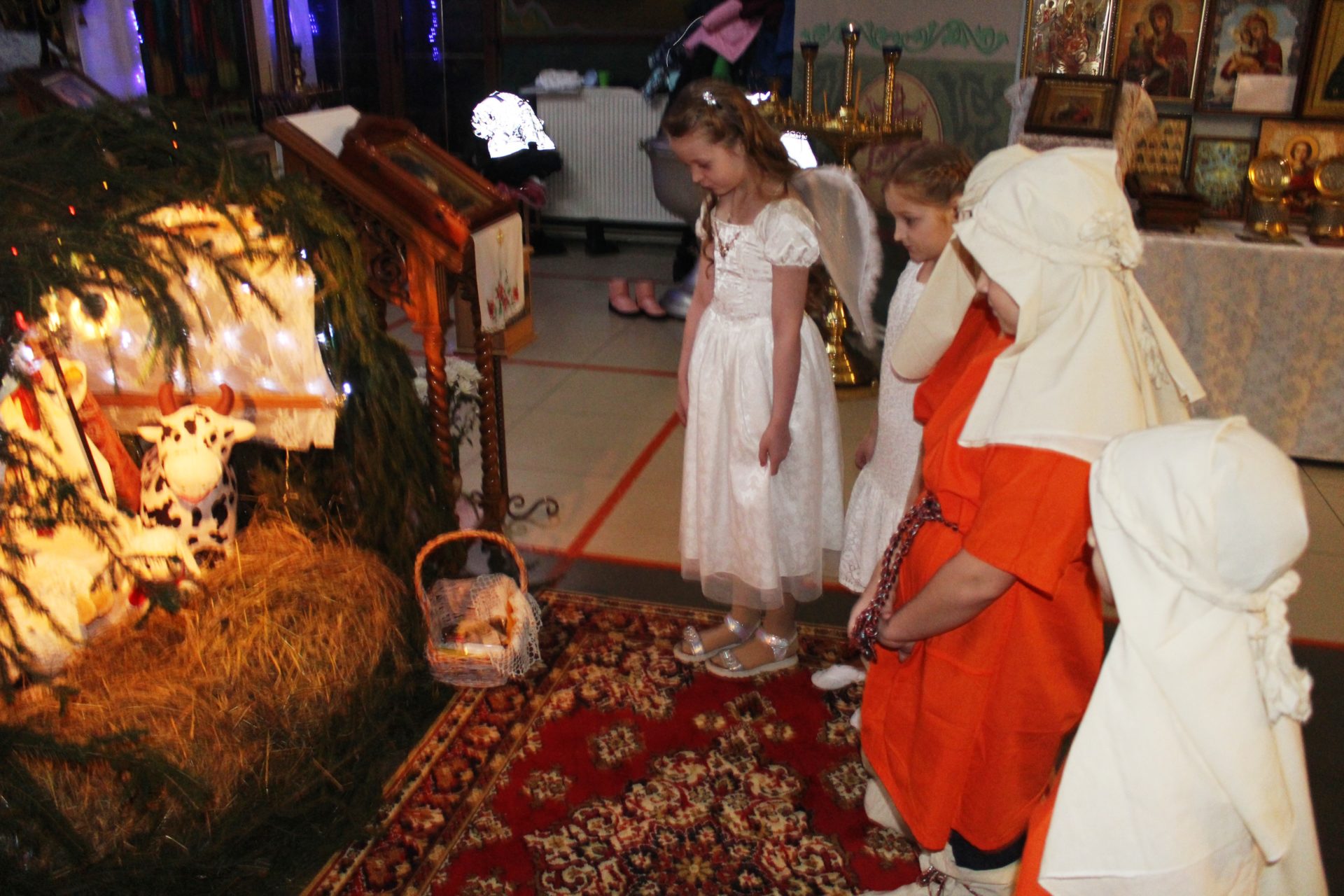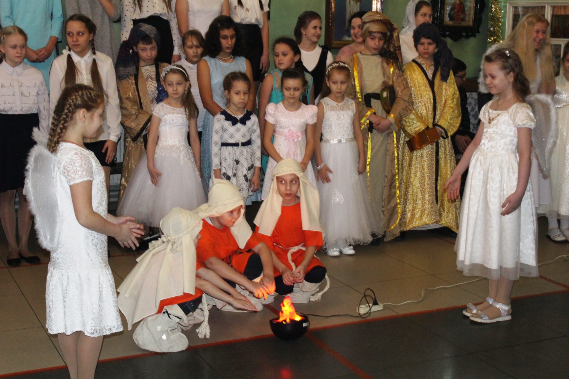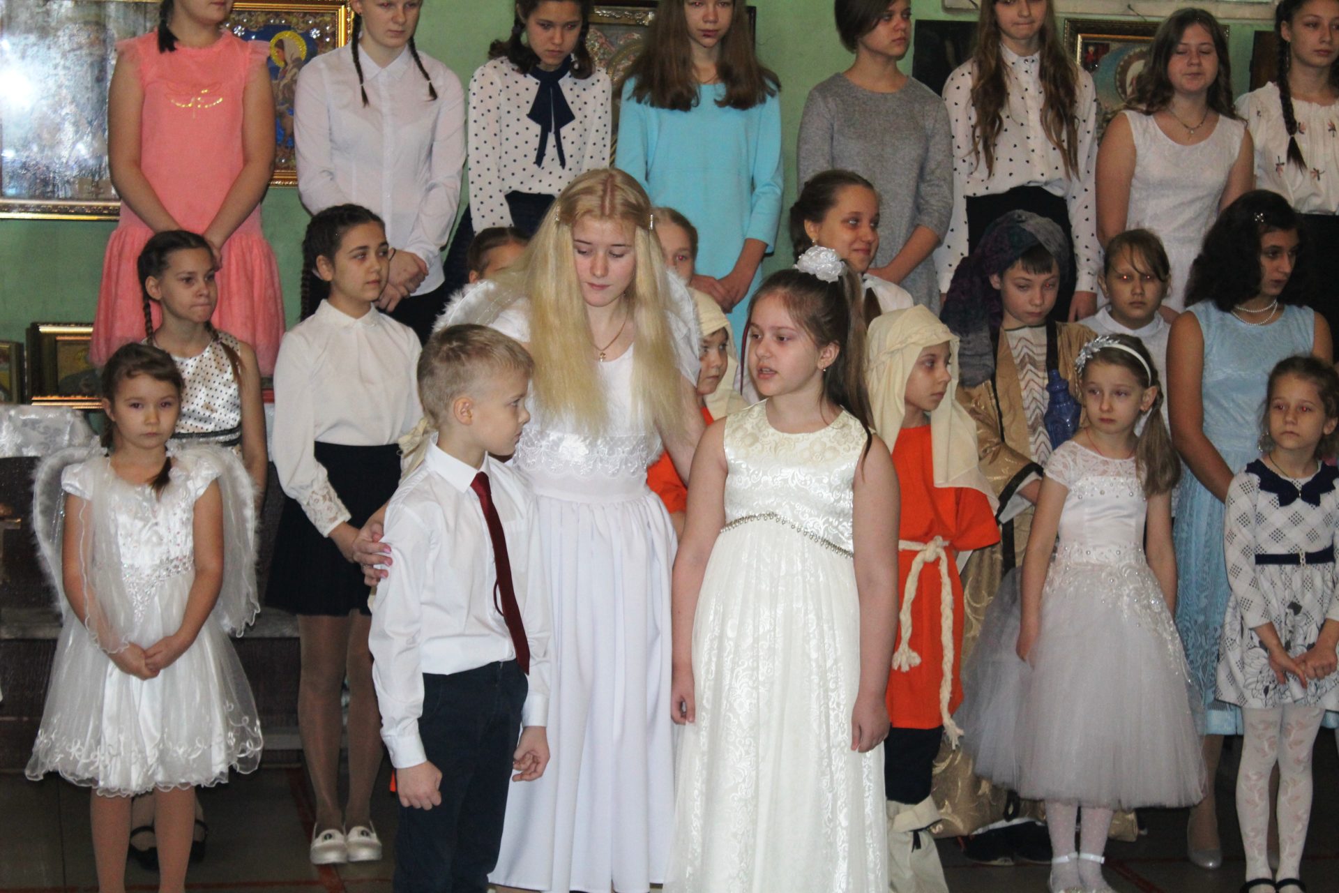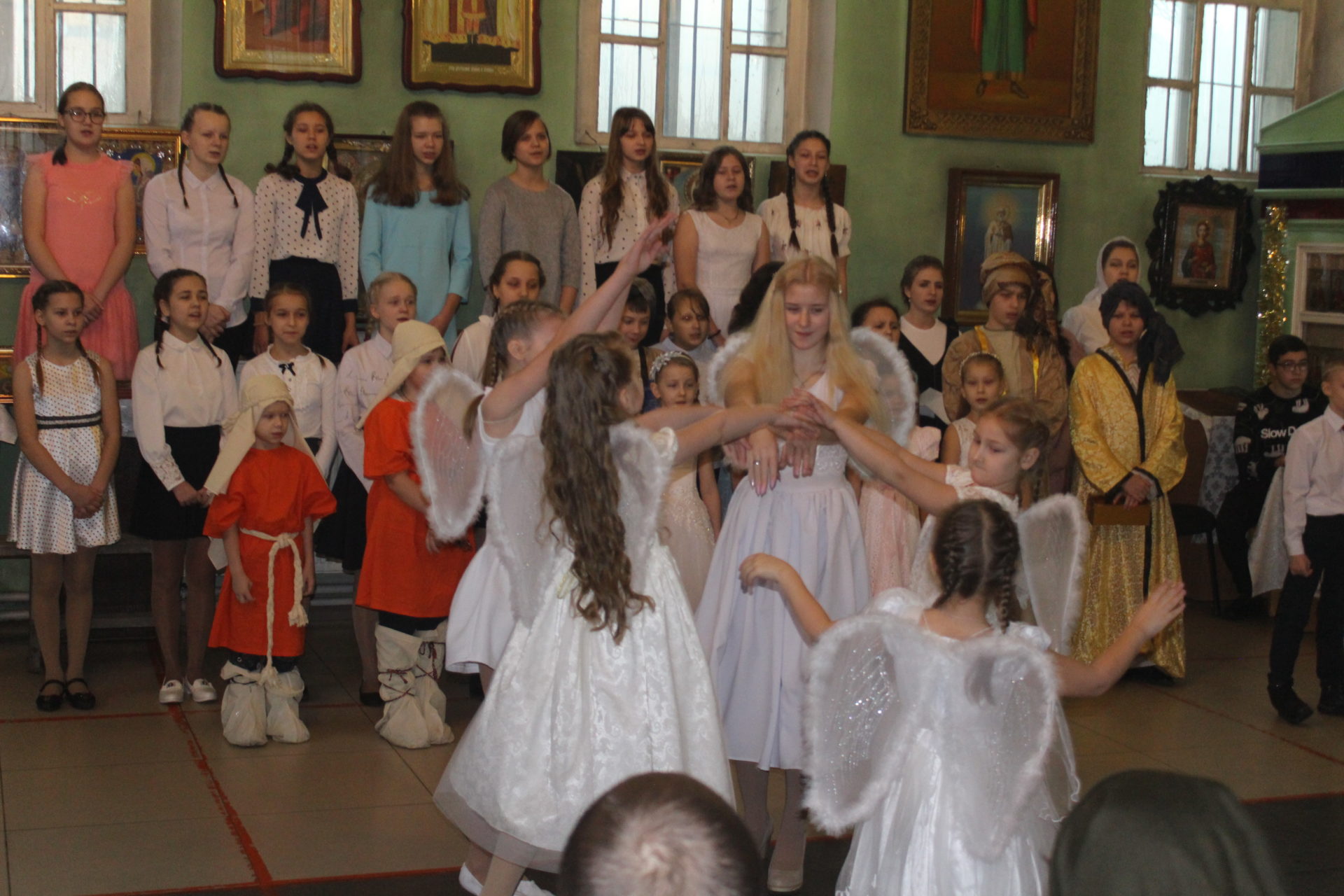 Хорошо известные евангельские события, повествующие о пришествии в мир Спасителя. Чередой сменяют друг друга на сцене, пастухи упавшие на колени при виде белокрылого Ангела, который благовестил о Рождении Спасителя. С замирание сердца все смотрели танец ангелов в исполнении девочек, которые кружились в белоснежном вихре рождественского вальса. Пастухи отправились поклониться новорождённому Младенцу Христу.