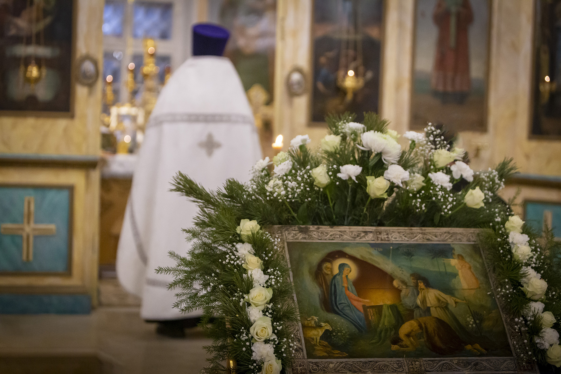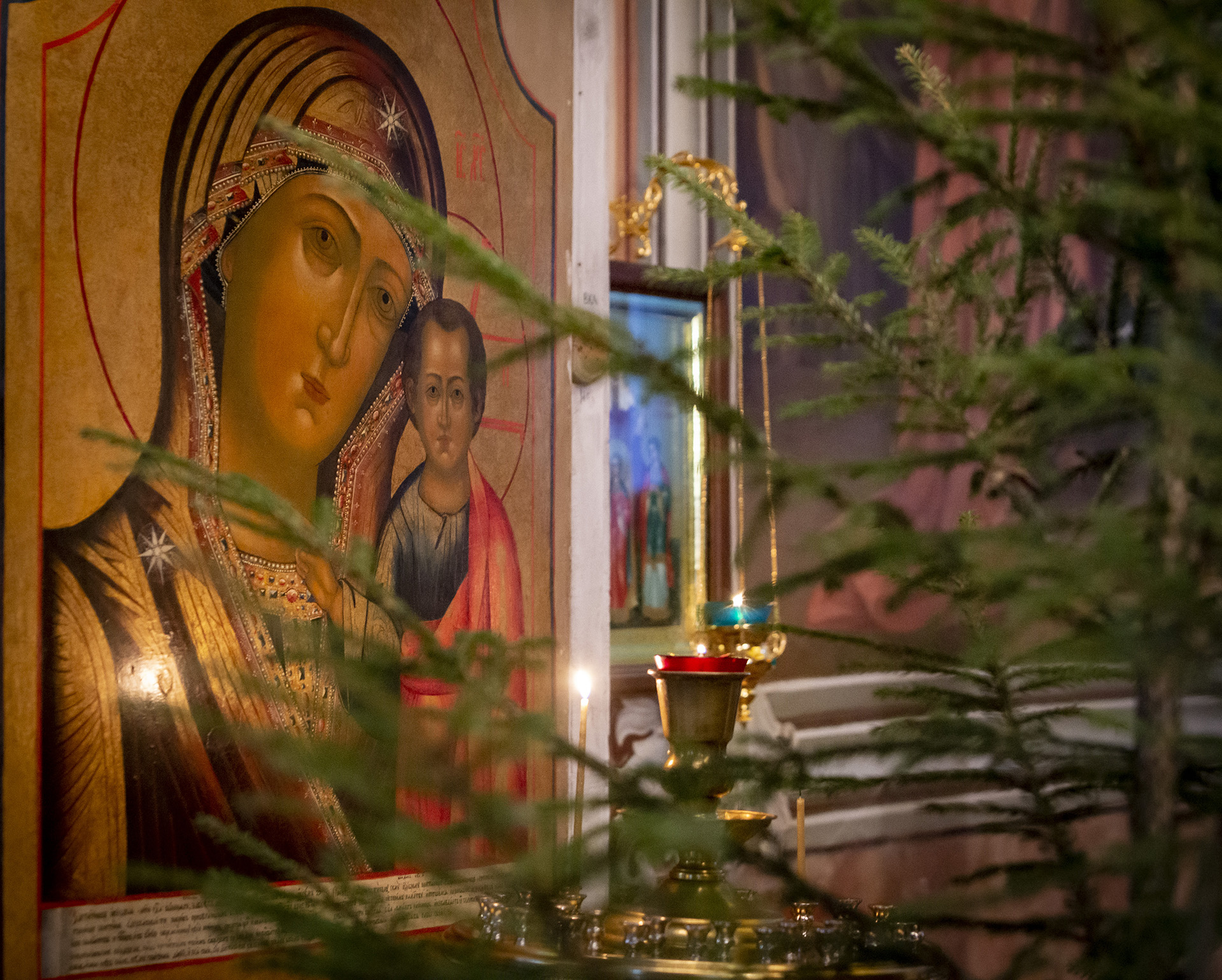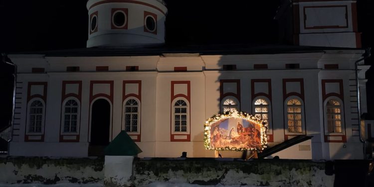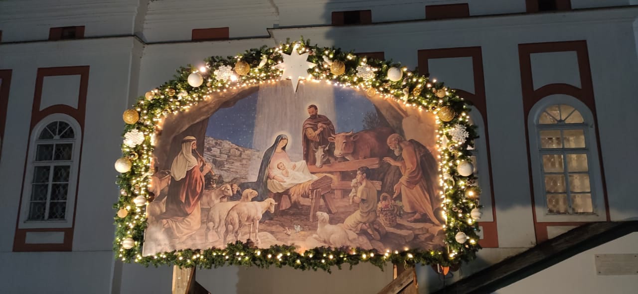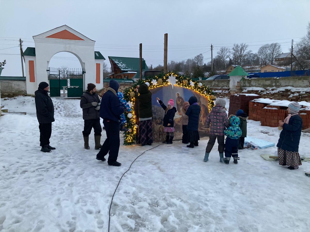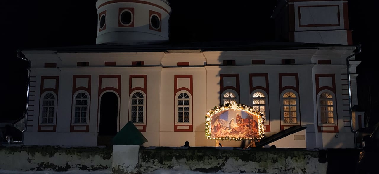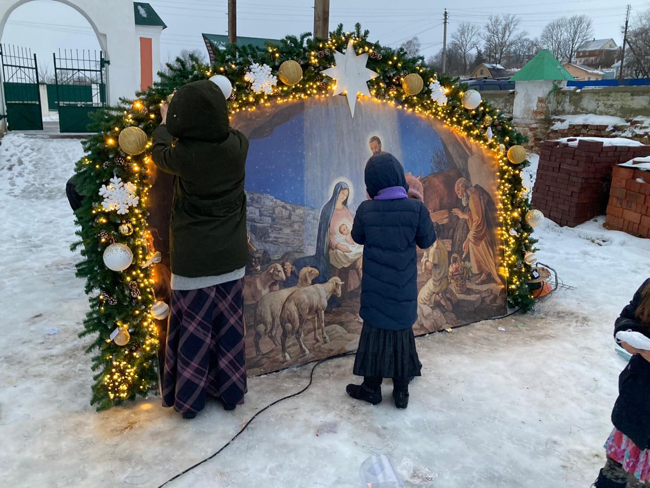 Еще накануне Рождественского Сочельника храм был нарядно украшен, так чтобы встретить праздник самым торжественным образом. Снаружи прихожане храма Николай и Михаил со своими семьями поставили вертеп из еловых ветвей с иконой Рождества Христова внутри. Его украсили световыми гирляндами, чтобы праздничную композицию было видно с дороги и в вечернее время.