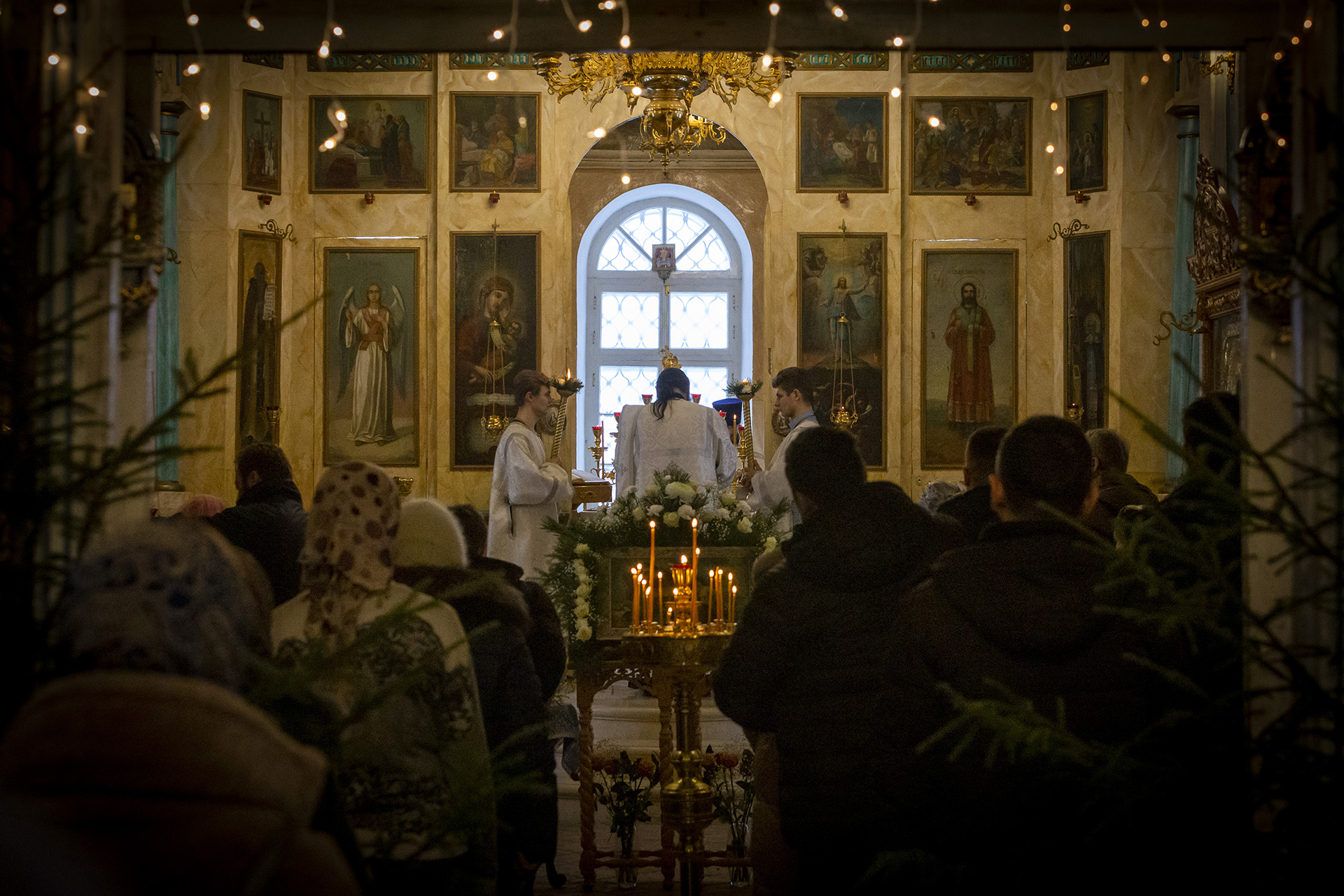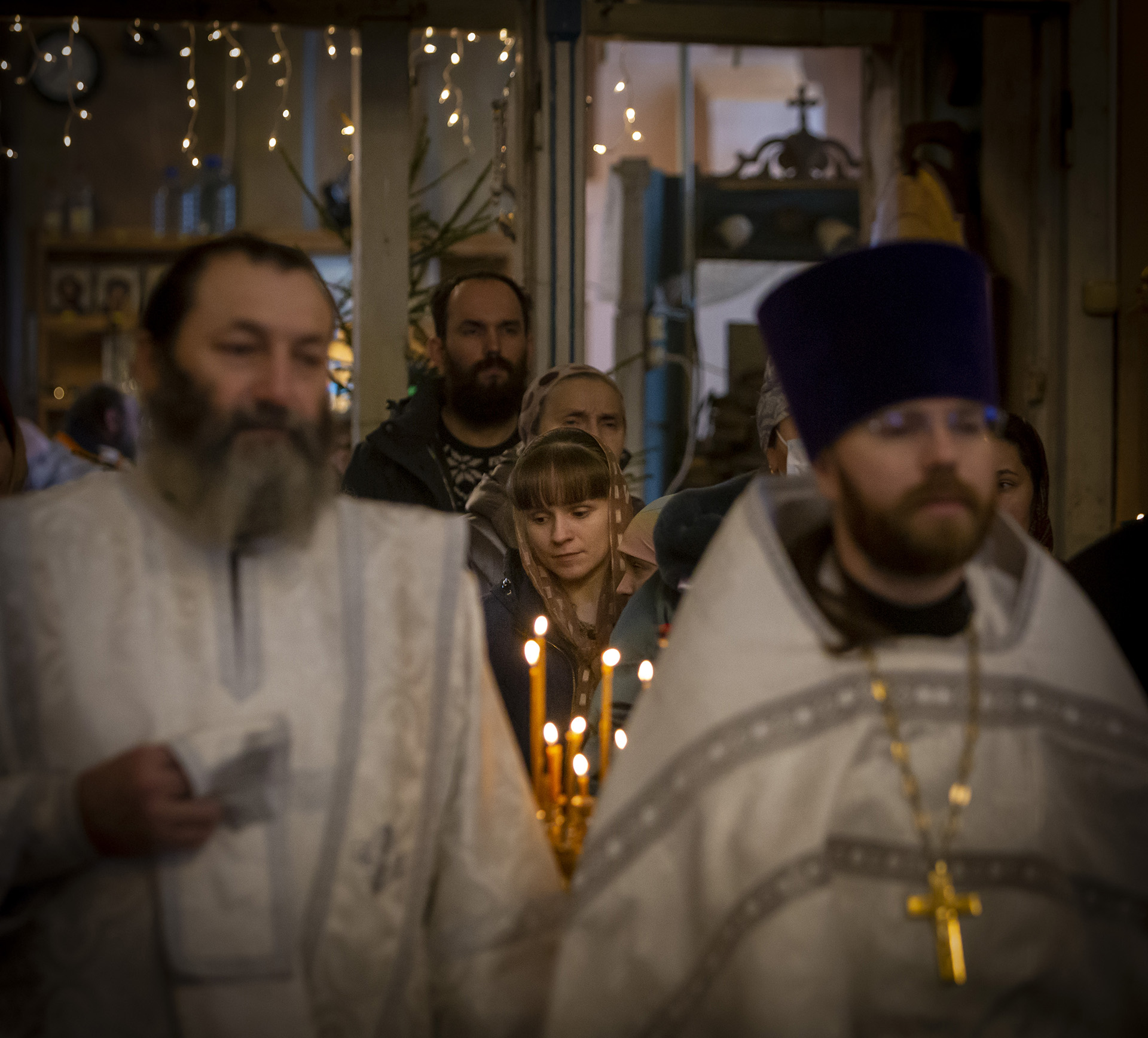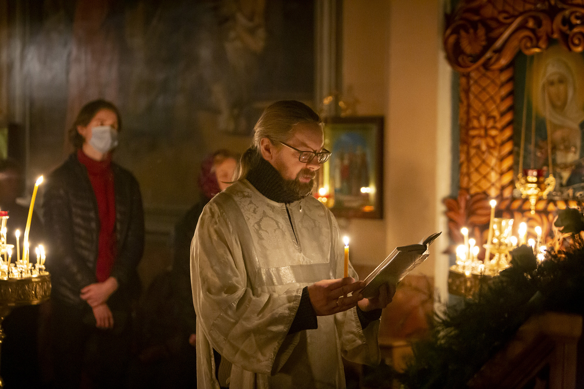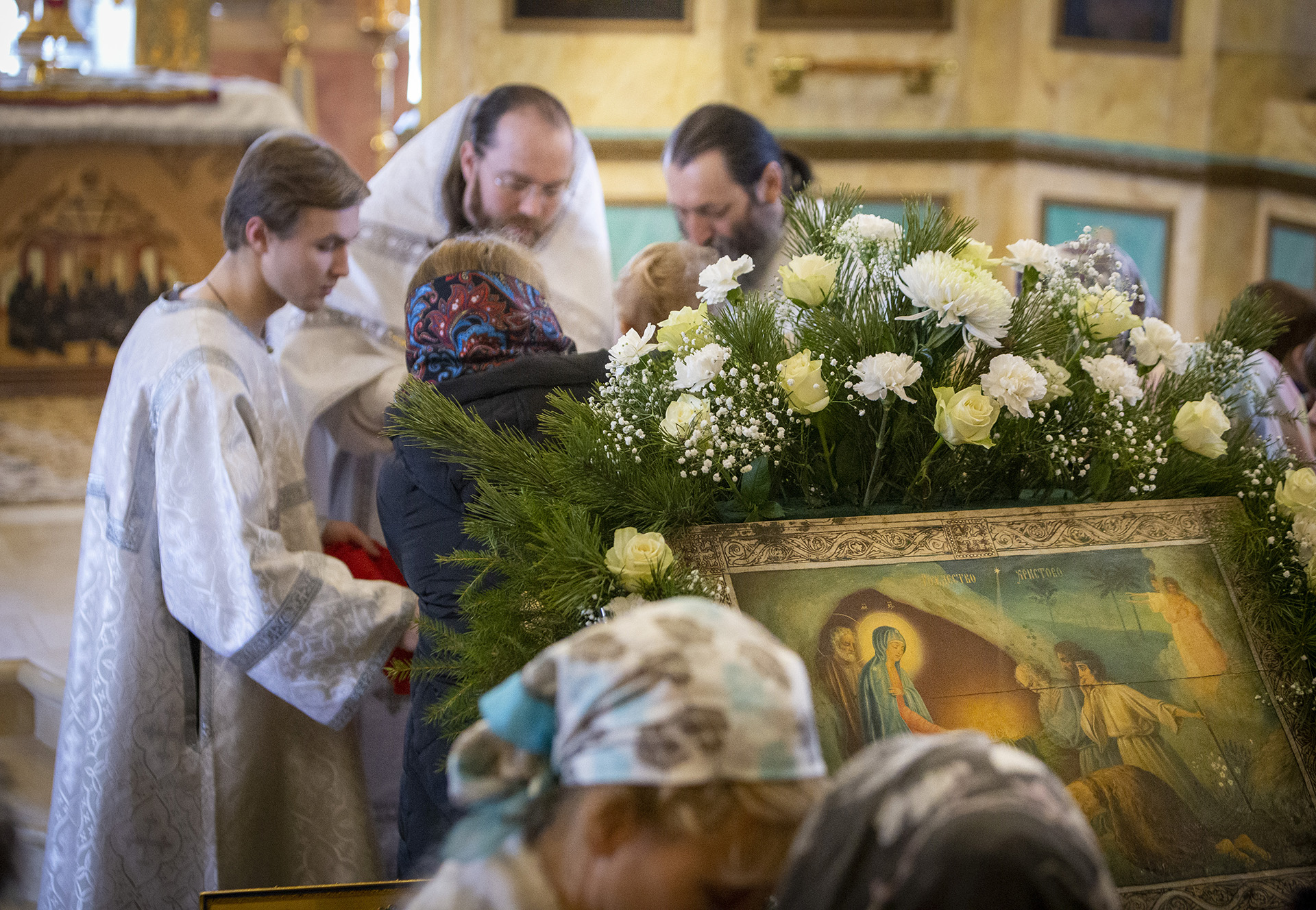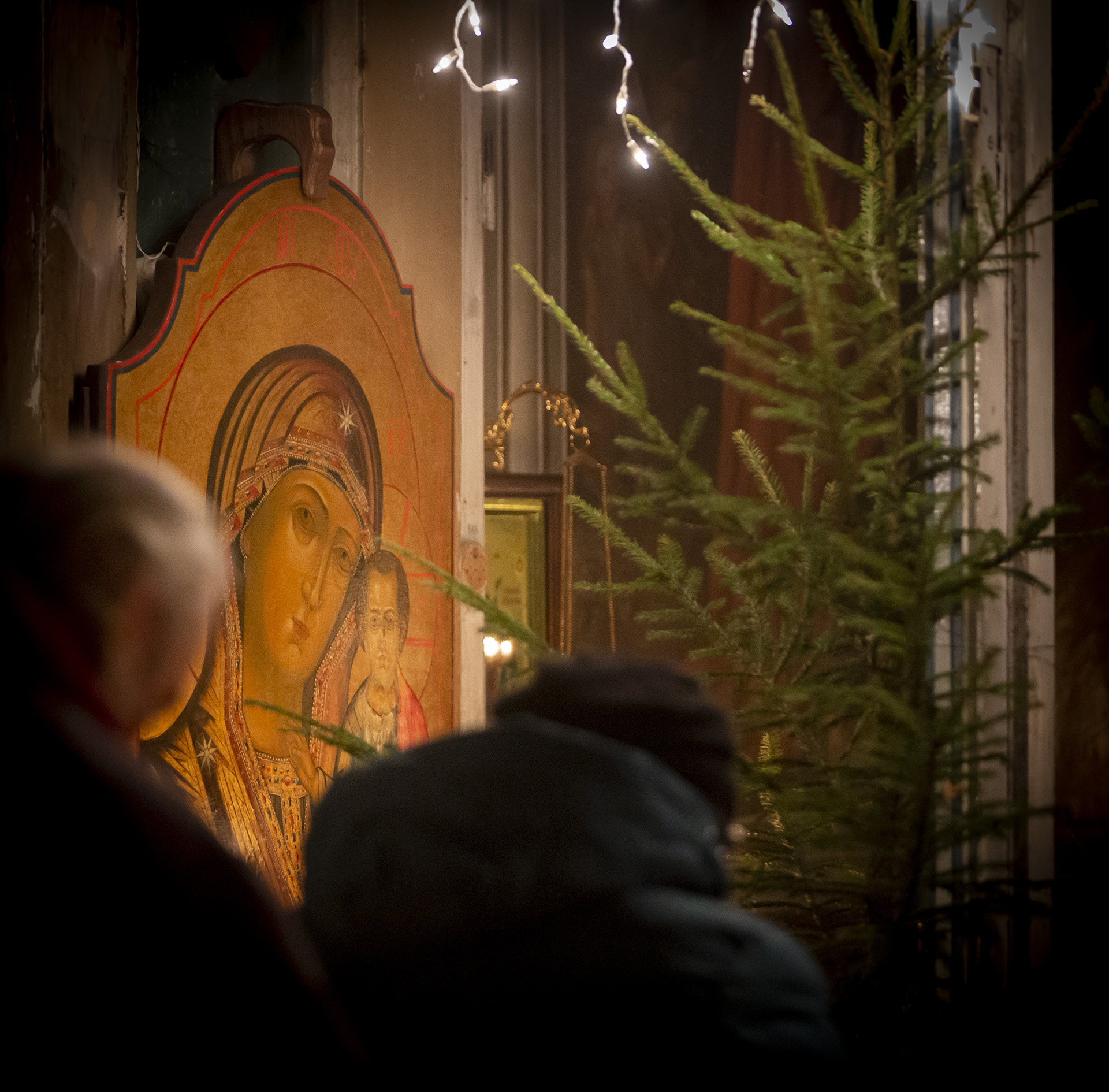 Еще накануне Рождественского Сочельника храм был нарядно украшен, так чтобы встретить праздник самым торжественным образом. Снаружи прихожане храма Николай и Михаил со своими семьями поставили вертеп из еловых ветвей с иконой Рождества Христова внутри. Его украсили световыми гирляндами, чтобы праздничную композицию было видно с дороги и в вечернее время.