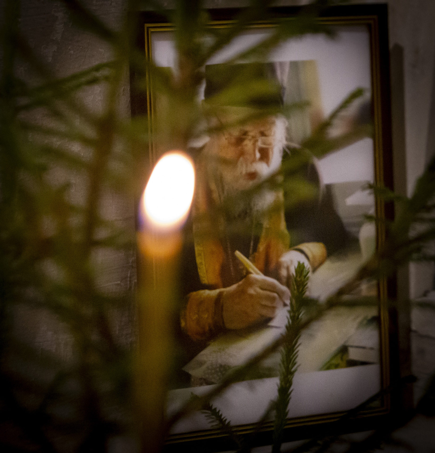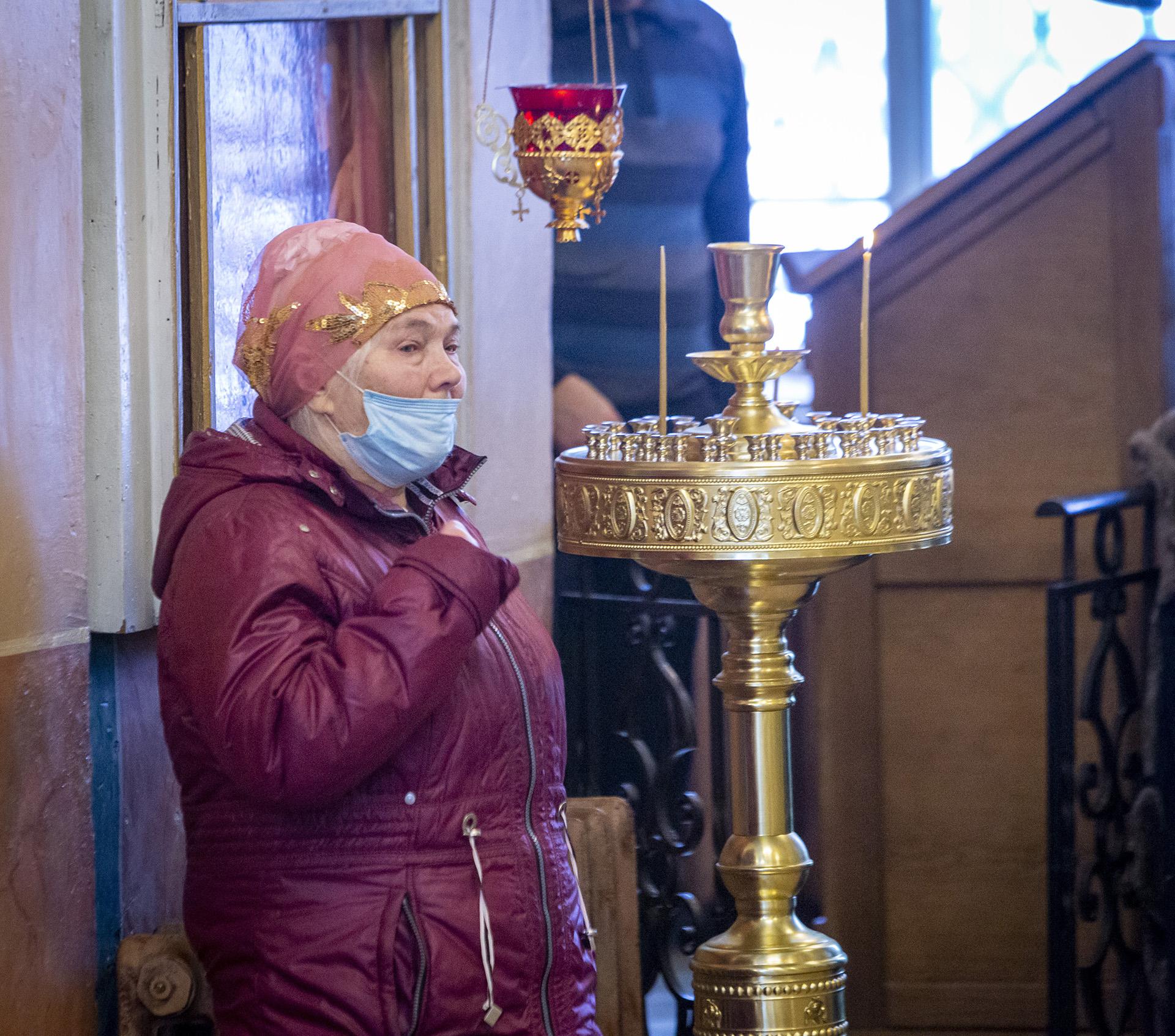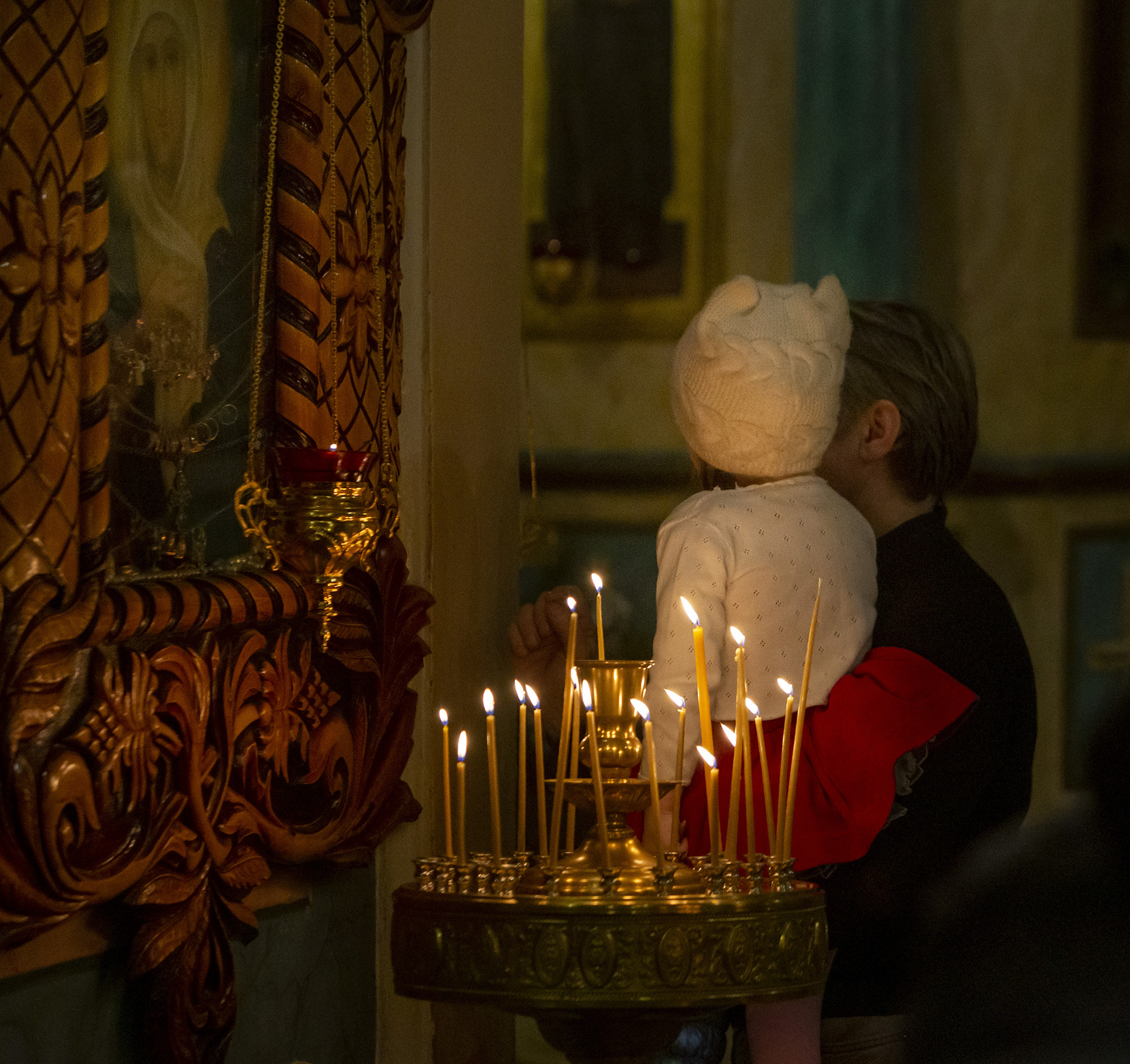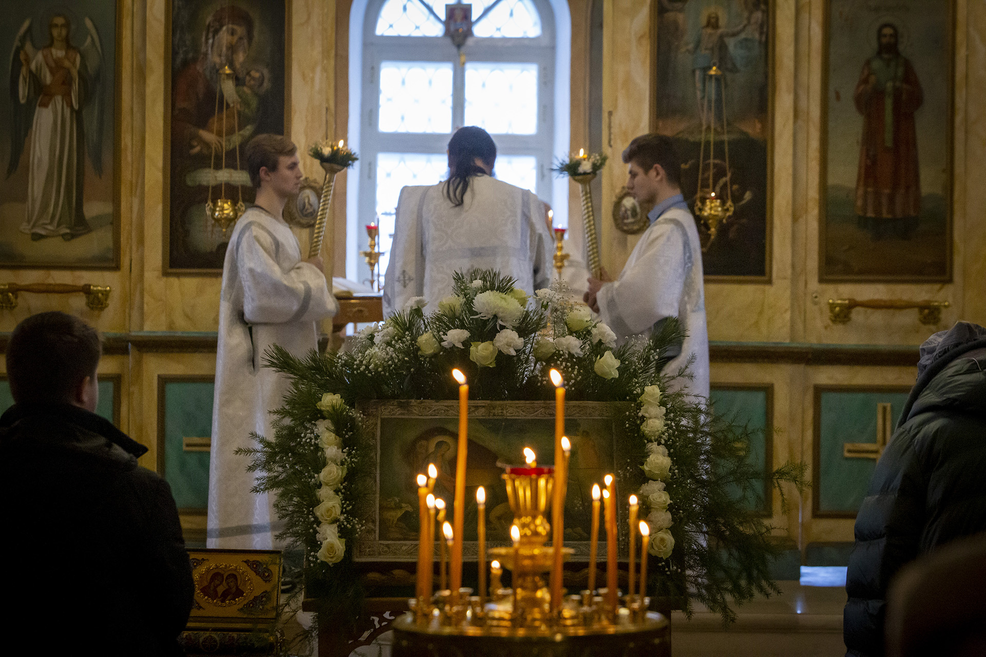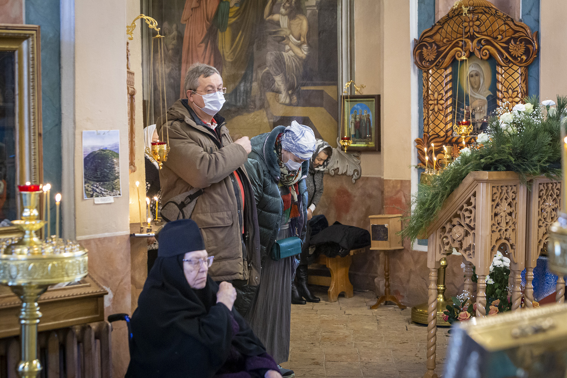 Еще накануне Рождественского Сочельника храм был нарядно украшен, так чтобы встретить праздник самым торжественным образом. Снаружи прихожане храма Николай и Михаил со своими семьями поставили вертеп из еловых ветвей с иконой Рождества Христова внутри. Его украсили световыми гирляндами, чтобы праздничную композицию было видно с дороги и в вечернее время.
