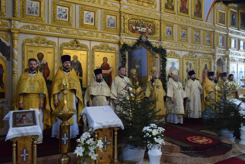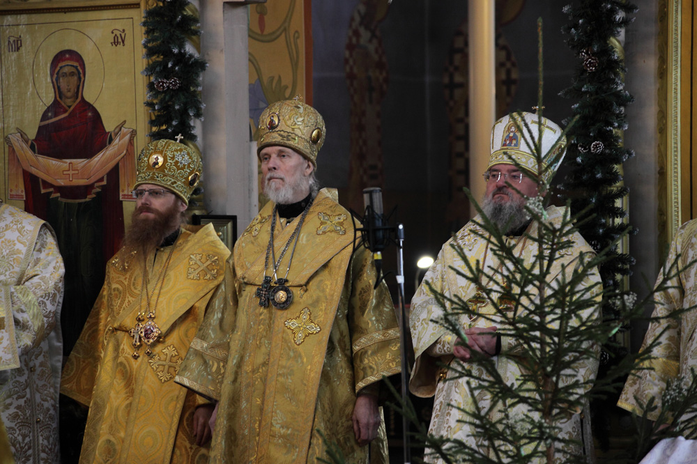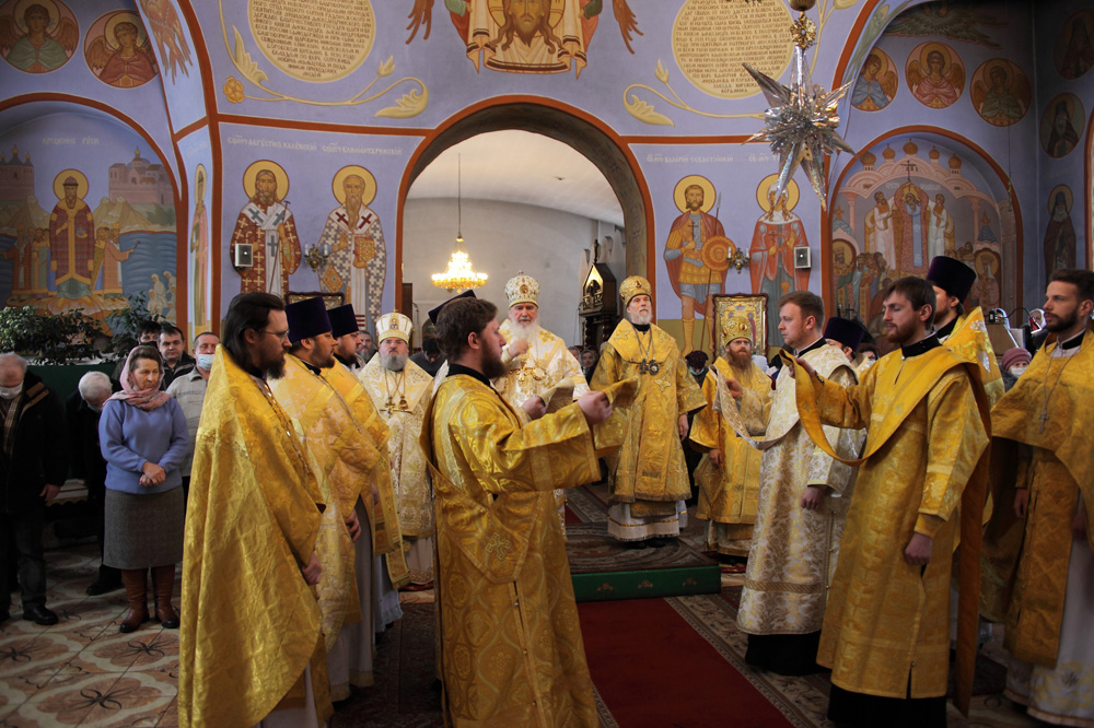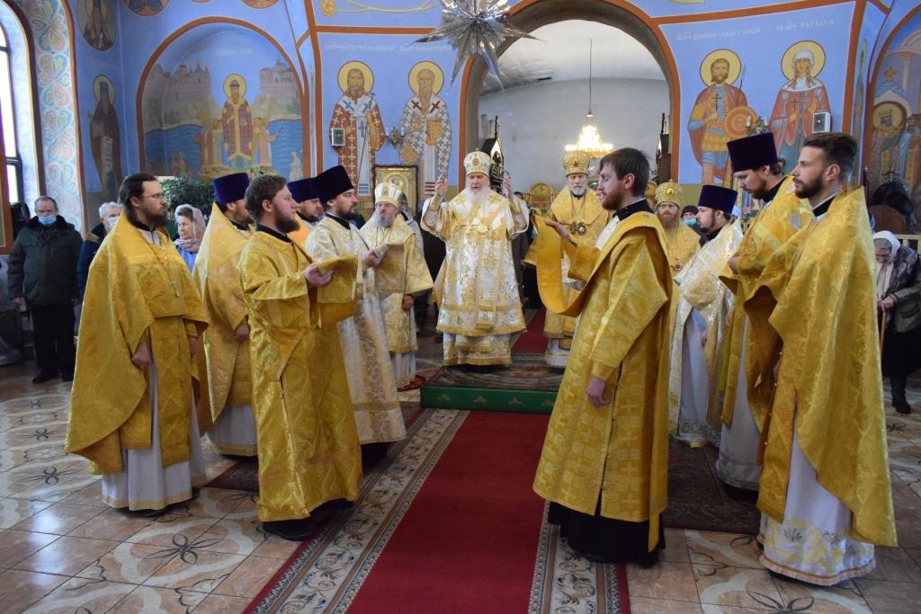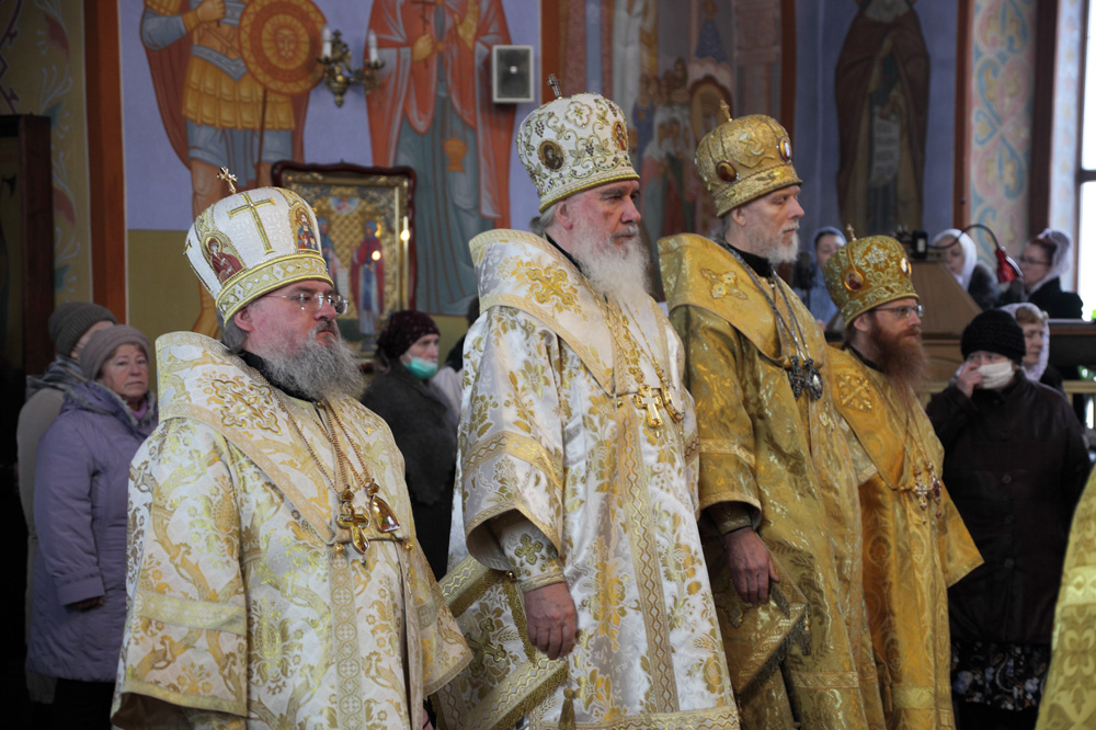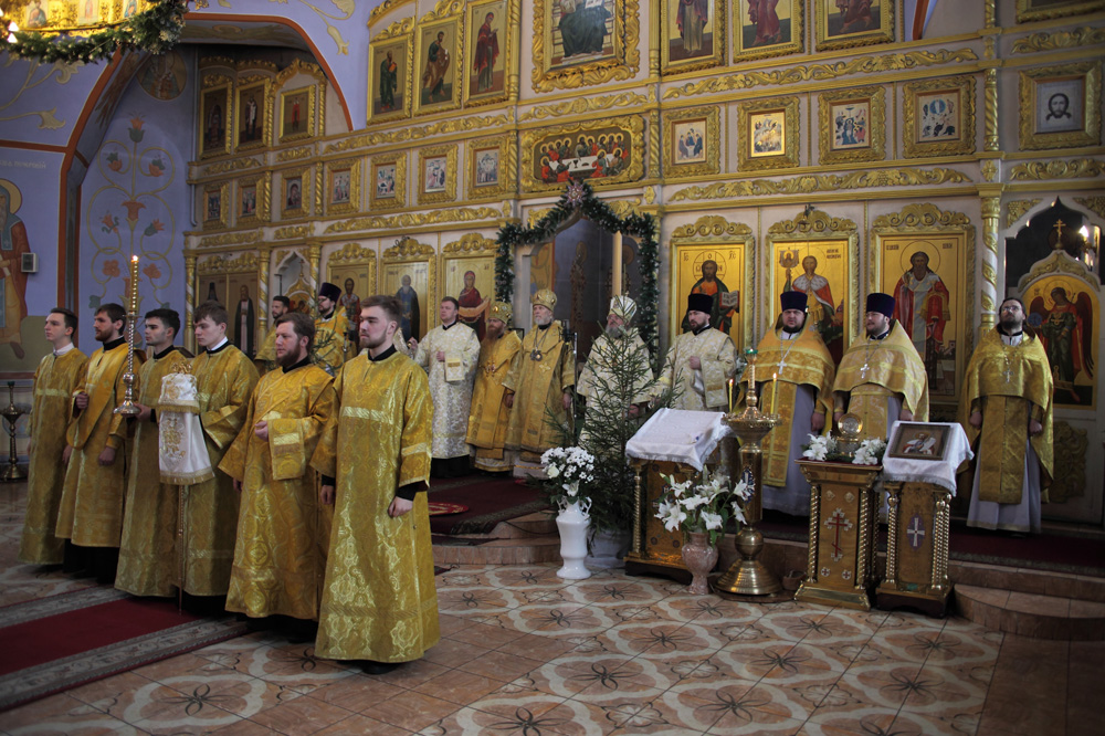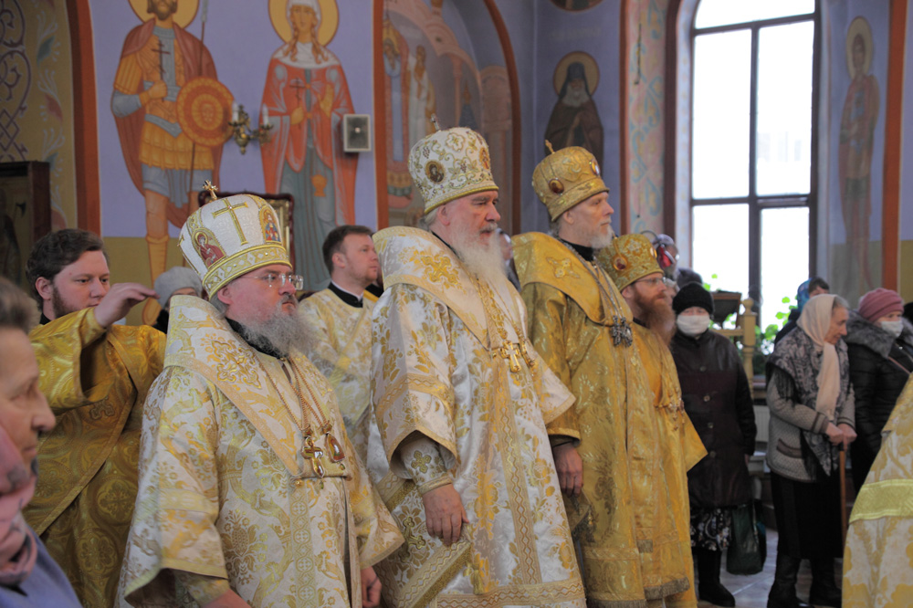 Архипастырям сослужили: протоиерей Александр Рябов — настоятель собора, протоиерей Алексей Пелевин, протоиерей Антоний Хатунцев, иерей Михаил Камышев, иеромонах Иоанн (Король), иерей Николай Жерздев, диаконский чин возглавил протодиакон Сергий Комаров.