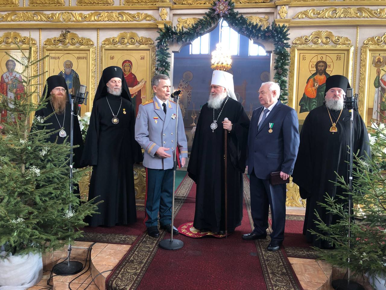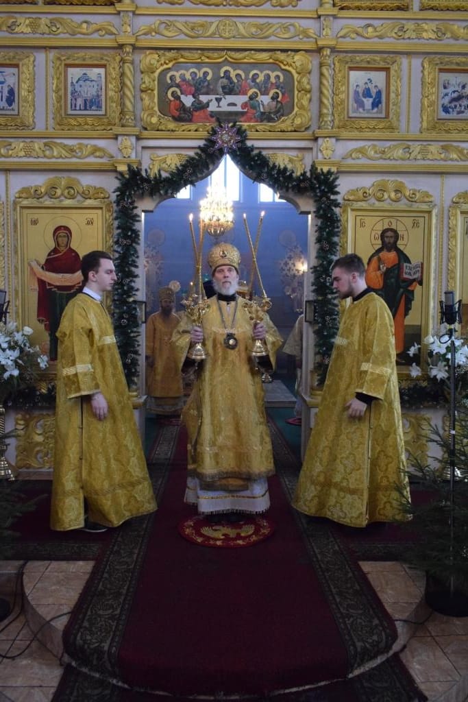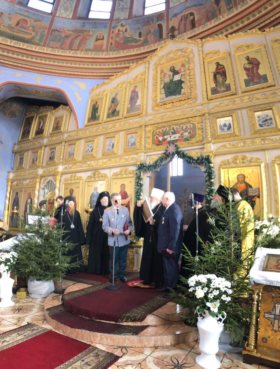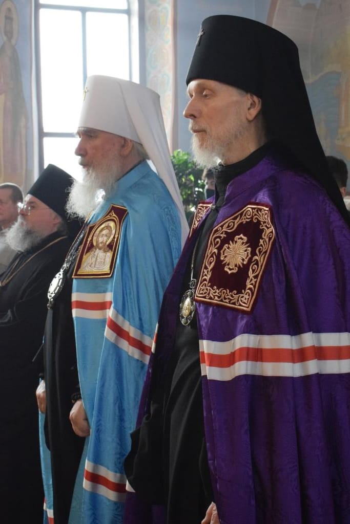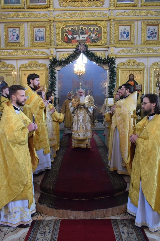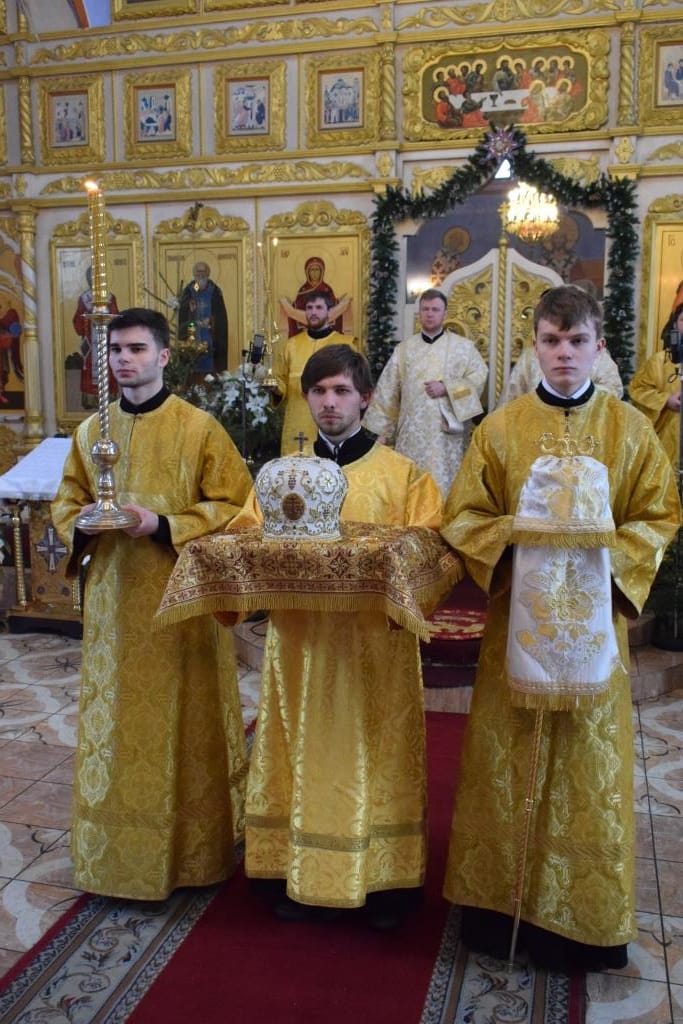 Архипастырям сослужили: протоиерей Александр Рябов — настоятель собора, протоиерей Алексей Пелевин, протоиерей Антоний Хатунцев, иерей Михаил Камышев, иеромонах Иоанн (Король), иерей Николай Жерздев, диаконский чин возглавил протодиакон Сергий Комаров.