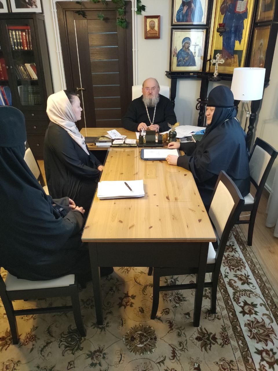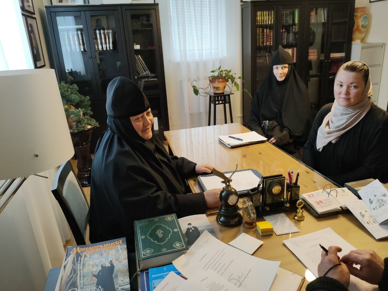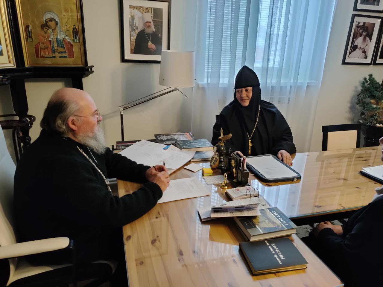 9 февраля в Козельском епархиальном управлении епископ Никита провел встречу с игуменией женского монастыря Успенская Феклина пустынь Виталией (Кочетовой) и Григорьевой Еленой Матвеевной.