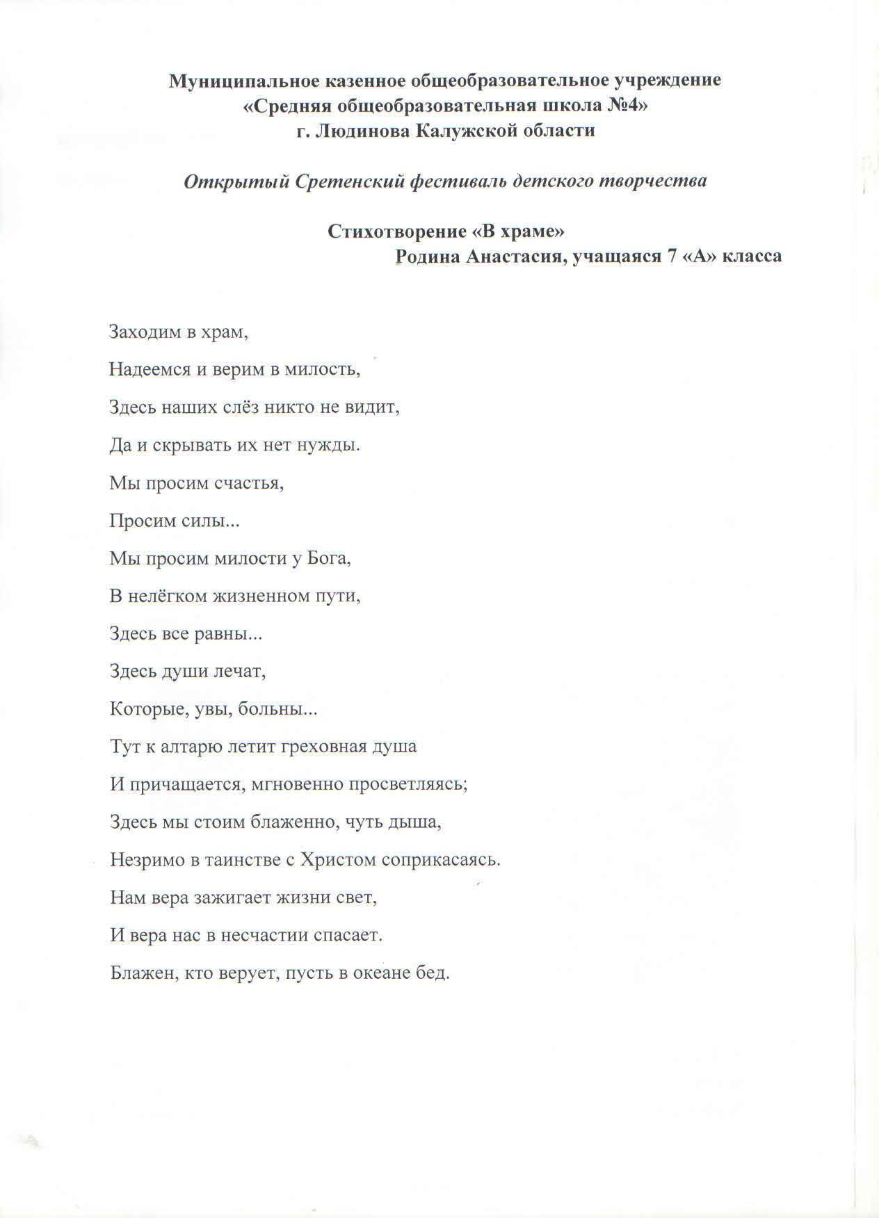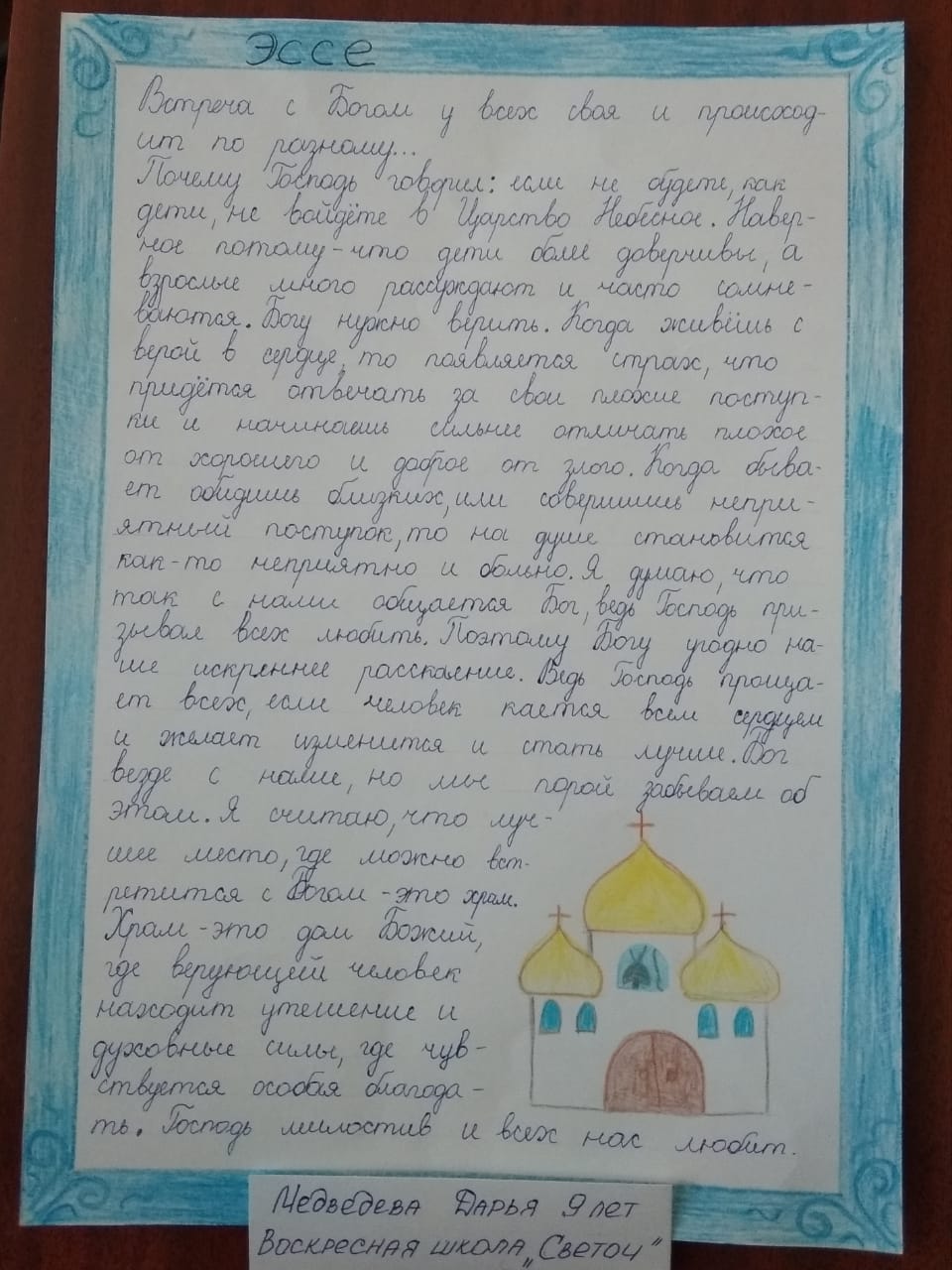 И если их, пока еще детские размышления, рисунки, декоративные работы призывают к хорошим и добрым встречам, заставляют нас, взрослых, задумываться о своей Встрече с Богом, значит, есть Надежда, значит, укрепится Вера, и в нас будет больше Любви и Милосердия.