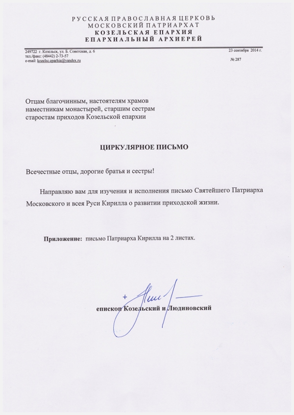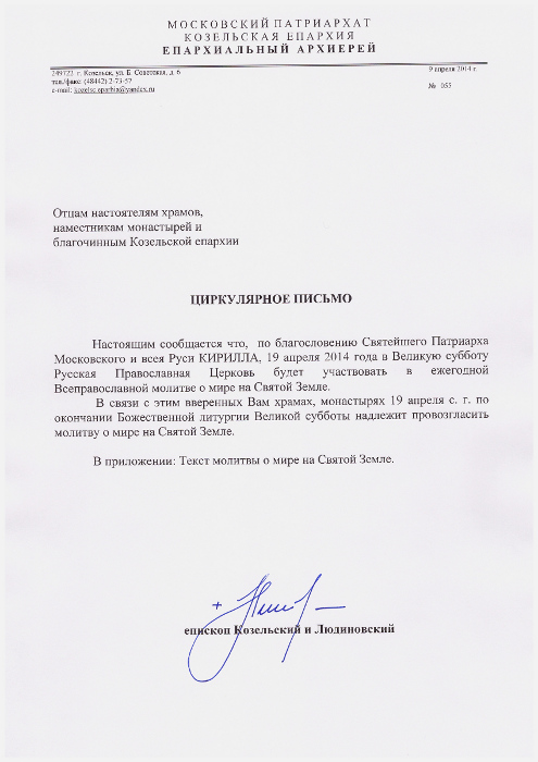 Циркулярное письмо духовенству Козельской и Людиновской епархий в связи с участием во Всеправославной молитве о ...