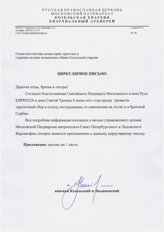 Циркулярное письмо духовенству Козельской епархий в связи со сбором средств в пользу пострадавших от наводнения ...