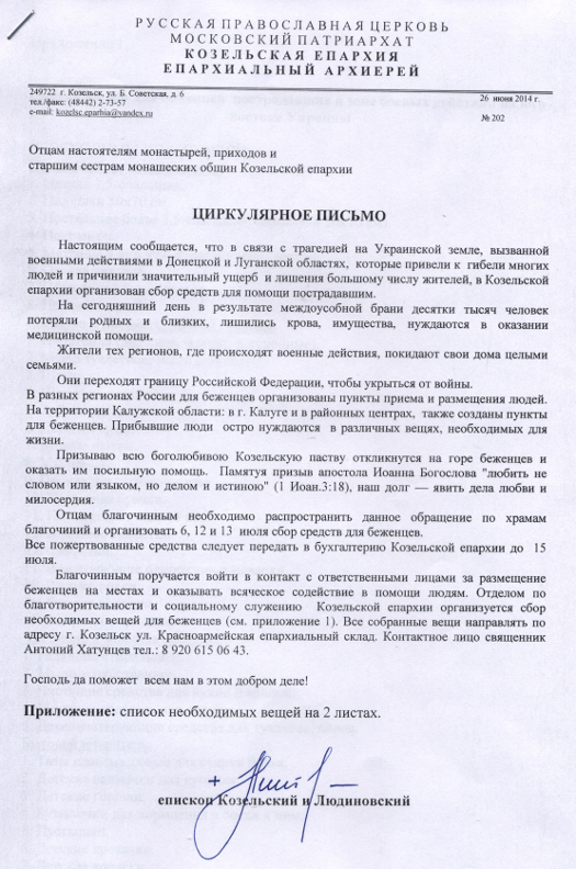 Циркулярное письмо духовенству Козельской епархий о сборе средств для помощи пострадавшим на Украине