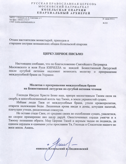 Циркулярное письмо духовенству Козельской епархий о Молитве за Украину