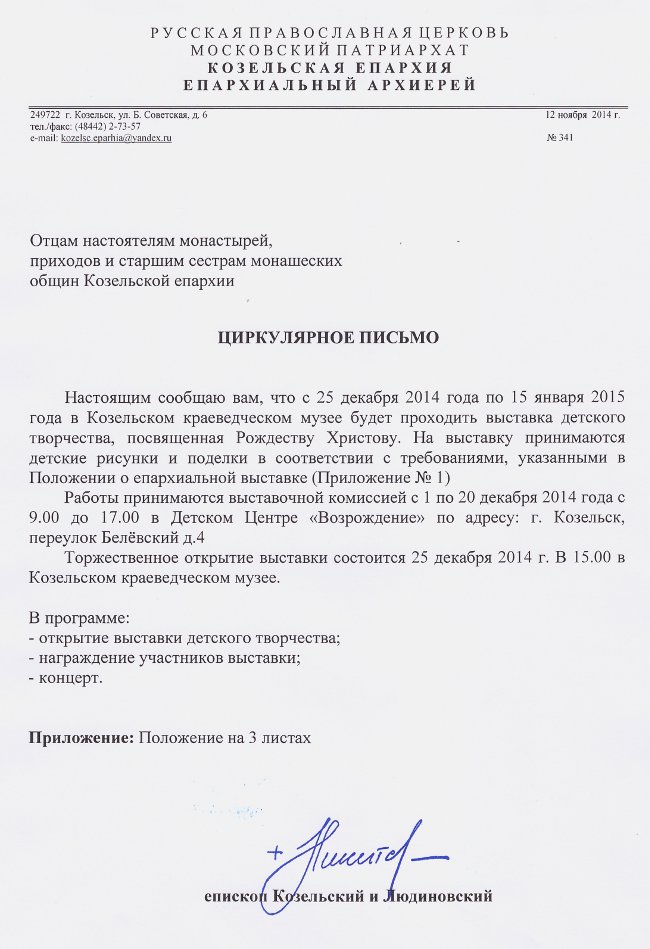 Циркулярное письмо отцам благочинным, настоятелям храмов, наместникам и настоятельницам монастырей Калужской митрополии о XVII Богородично-Рождественских ...