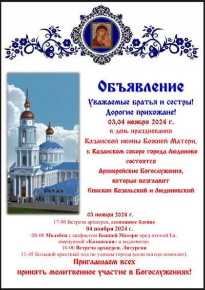 31 октября 2024 года в Казанском соборе города Людиново настоятель храма протоиерей Алексий Жиганов отслужил молебен с акафистом перед иконой ... -