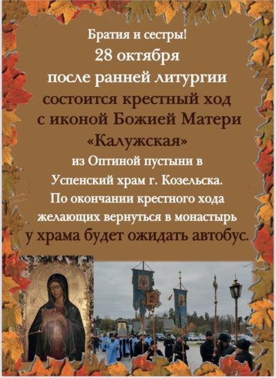 28 октября состоялся крестный ход с Калужской иконой Божией Матери из ставропигиального мужского монастыря Свято-Введенская Оптина пустынь в Успенский кафедральный ... -