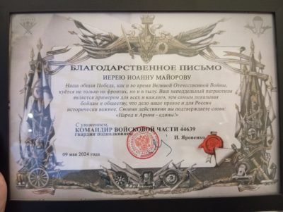 Настоятелю храма «Живоносный Источник» в городе Людиново вручили благодарственное письмо от военных