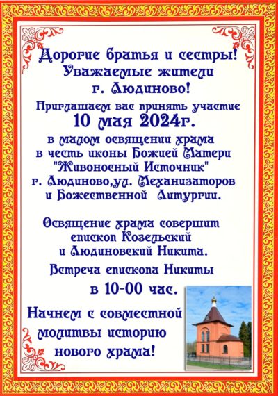 10 мая приглашаем всех принять участие в богослужении малого освящения храма иконы Божией Матери «Живоносный источник» и первой Божественной литургии ...