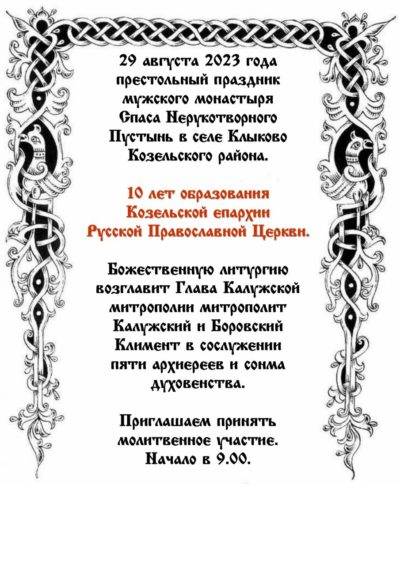 Дорогие друзья! Приглашаем Вас принять молитвенное участие в престольном торжестве мужского монастыря Спаса Нерукотворного пустынь в селе Клыково Козельского района ...