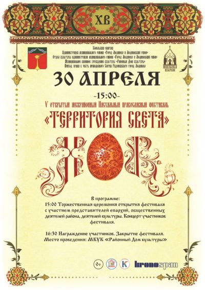 30 апреля в городе Людиново состоится V открытый межрайонный Пасхальный православный фестиваль «ТЕРРИТОРИЯ СВЕТА»