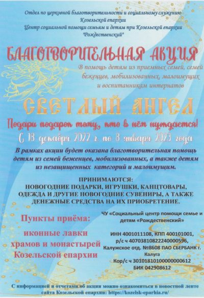 С 18 декабря 2022 года по 8 января 2023 года на приходах и в монастырях Козельской епархии пройдет благотворительная акция ... -