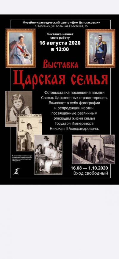 16 августа 2020 года в Музейно-краеведческом центре «Дом Цыплакова» города Козельска начнет свою работу выставка «Царская семья» . Выставка будет ...