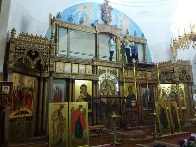 Установка икон Деисусного ряда в Успенском соборе города Козельска