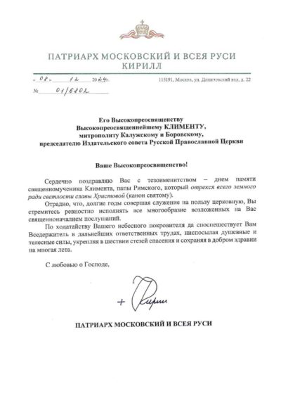Поздравительный адрес Святейшего Патриарха Московского и всея Руси Кирилла, ко Дню тезоименитства митрополита Калужского и Боровского Климента -