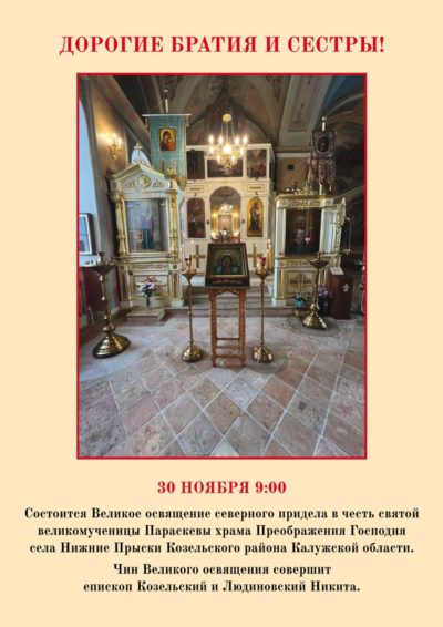 Дорогие братья и сестры! В субботу 30 ноября 2024 года состоится Великое освящение северного придела в честь святой великомученицы Параскевы ... -